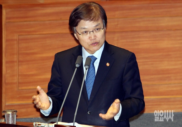 최양희 미래창조과학부 장관이 5일 서울 여의도 국회 본회의장에서 열린 교육·사회·문화 분야 대정부 질문에서 의원들의 질의에 답하고 있다.