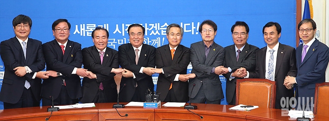 (사진 왼쪽 세 번째부터) 장휘국 광주시교육감, 새정치민주연합 문희상 비상대책위원장, 우윤근 원내대표, 조희연 서울시교육감, 백재현 사무총장, 안규백 정책위의장 등이 5일, 서울 여의도 국회 새정치민주연합 당대표 회의실에서 열린 전국 시도교육감협의회 회장단 간담회에서 기념촬영을 하고 있다.