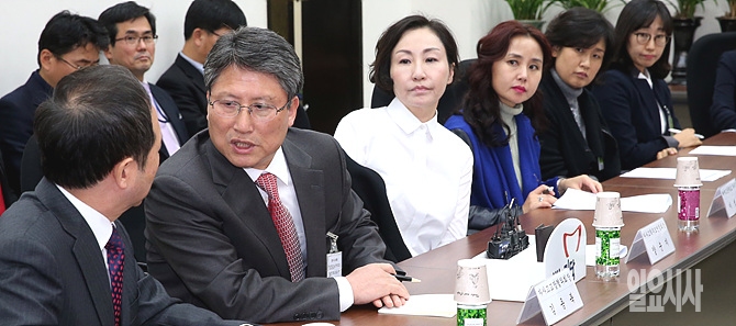 5일, 서울 여의도 국회에서 새누리당 주호영 정책위의장, 신성범 의원, 김용복 자사고교장협의회장, 양순지 학부모협의회장 등이 참석해 면담 을 갖고 있는 가운데, 김 자사고교장협회장이 다른 참석자와 대화하고 있다.