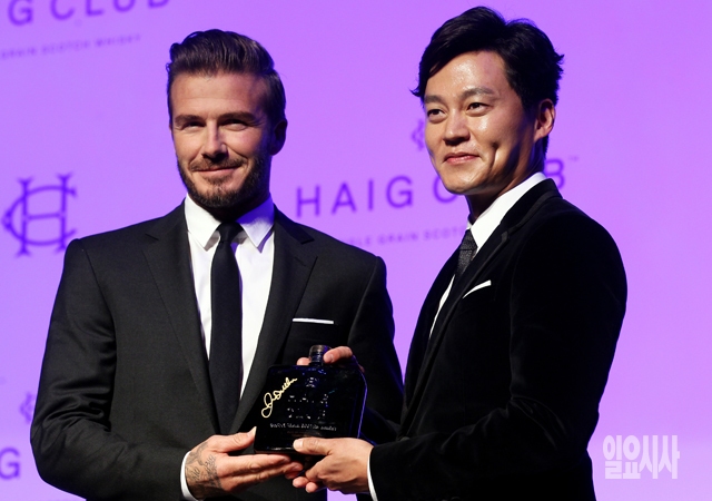 베컴(왼쪽)과 이서진이 5일 서울 한남동 그랜드하얏트서울 호텔에서 열린 싱글 그레인 위스키 '헤이그 클럽' 런칭 기자간담회에 참석해 포즈를 취하고 있다.