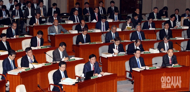 정홍원 국무총리를 비롯한 국무위원들이 6일 서울 여의도 국회에서 열린 예산결산특별위원회에 참석해 의원들의 질의를 경청하고 있다.