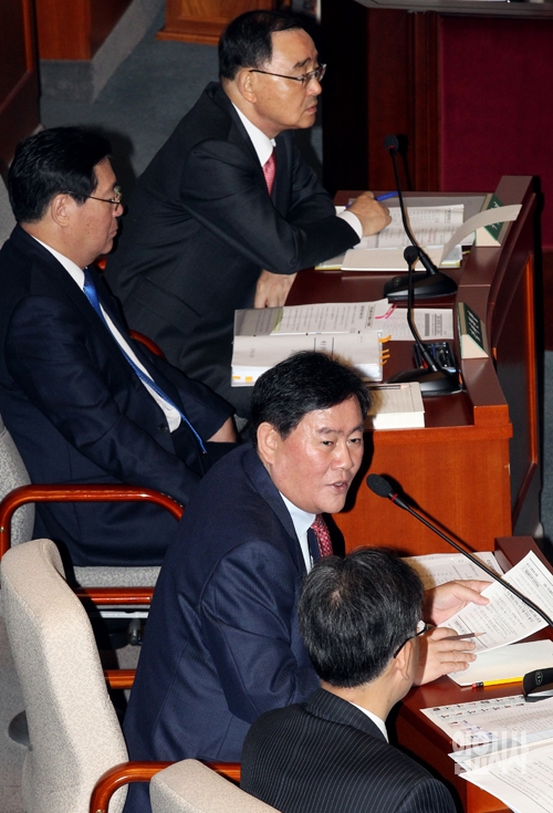 최경환 경제부총리 겸 기획재정부 장관이 6일 서울 여의도 국회에서 열린 예산결산특별위원회에서 의원들의 질의에 답하고 있다.