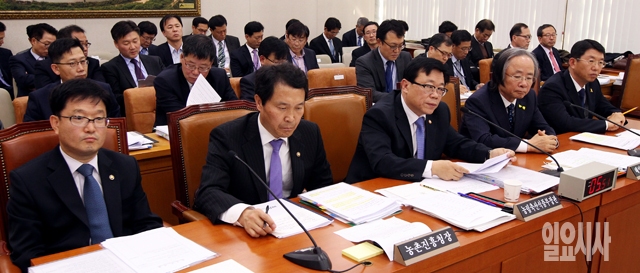 6일 서울 여의도 국회에서 열린 농림축산식품해양수산위원회 전체회의에 참석자들이 의원들의 질의를 경청하고 있다. 왼쪽부터 신원섭 산림청장, 이양호 농촌진흥청장, 이동필 농림축산식품부 장관, 이주영 해양수산부 장관, 김석균 해양경찰청장.