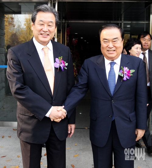 새누리당 김무성 대표(왼쪽)와 새정치민주연합 문희상 비상대책위원장이 6일 서울 방이동 올림픽공원 SK핸드볼경기장에서 열린 '2014 간호정책 선포식 및 2015 서울 세계간호사대회 조직위 출범식'에서 인사를 나누고 있다.