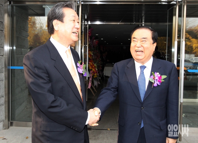 새누리당 김무성 대표(왼쪽)와 새정치민주연합 문희상 비상대책위원장이 6일 서울 방이동 올림픽공원 SK핸드볼경기장에서 열린 '2014 간호정책 선포식 및 2015 서울 세계간호사대회 조직위 출범식'에서 인사를 나누고 있다.