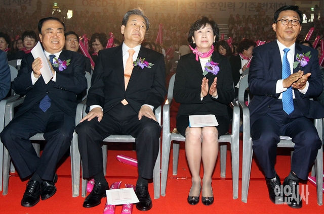 6일 서울 방이동 올림픽공원 SK핸드볼경기장에서 열린 '2014 간호정책 선포식 및 2015 서울 세계간호사대회 조직위 출범식'에서 참석자들이 박수를 치고 있다. 왼쪽부터 새정치민주연합 문희상 비상대책위원장, 새누리당 김무성 대표, 김옥수 대한간호협회 회장, 김춘진 국회보건복지위원장.