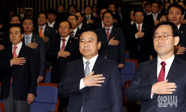 새누리당 이완구 원내대표를 비롯한 참석의원들이 7일 서울 여의도 국회에서 열린 의원총회에서 국기에 대한 경례를 하고 있다.