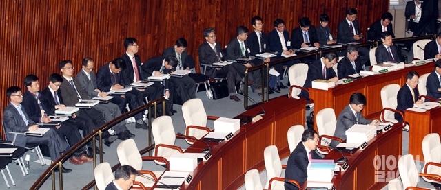 7일 서울 여의도 국회에서 열린 예산결산특별위원회 전체회의에서 각 부처 관계 공무원들이 좌석을 꽉 메운 채 의원들의 질의를 경청하고 있다.