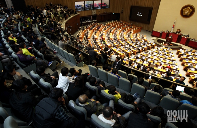7일 서울 여의도 국회에서 열린 본회의에서 세월호 유가족들이 법안 처리 과정을 지켜보고 있다. 이날 국회는 4.16세월호참사 진상규명 및 안전사회 건설 등을 위한 특별법안을 재석의원 251명 중 찬성 212명, 반대 12명, 기권 27명으로 통과시켰다.