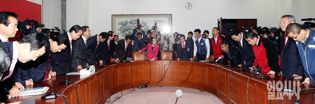 새누리당 김무성 대표를 비롯한 참석의원들이 7일 서울 여의도 국회 당대표실에서 공무원연금개혁 관련 공무원투쟁본부 지도부와의 면담에 앞서 인사를 나누고 있다.