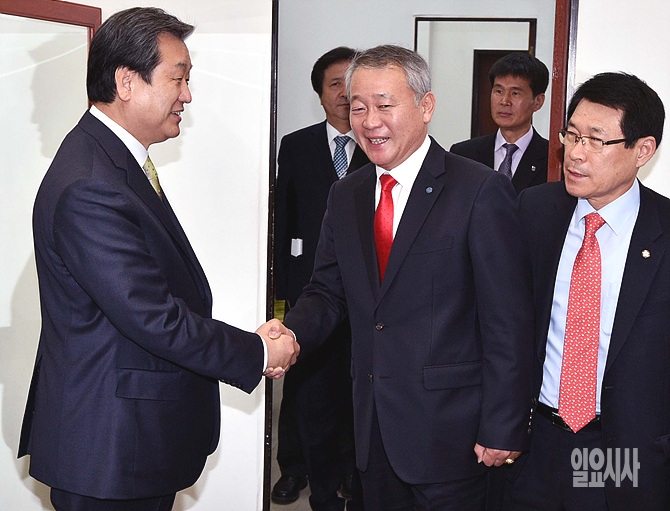 25일 오전 서울 여의도 국회에서 새누리당 김무성 대표가 공무원연금개혁 관련 교총 관계자와의 간담회에 참석자들과 악수로 인사를 나누고 있다.