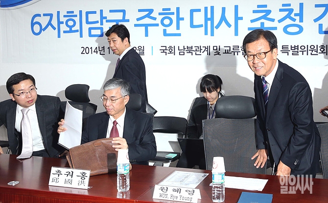 원혜영 국회 남북관계 및 교류협력 발전 특별위원회 위원장이 26일 오후 서울 여의도 국회 의원회관에서 열린 '6자회담국 주한대사 초청 간담회'에 참석하고 있다.