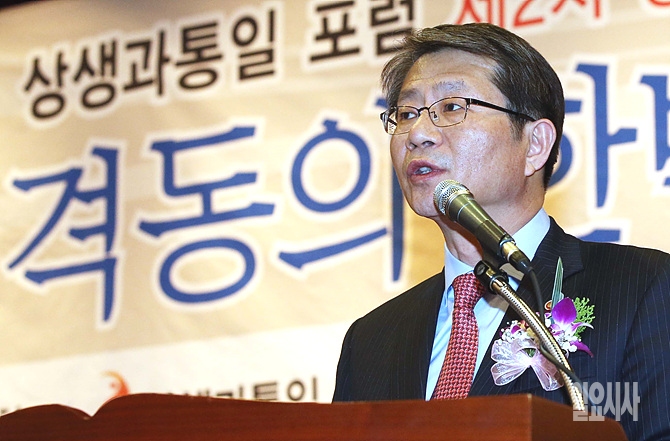 26일 오후, 서울 여의도 국회 도서관 대강당에서 열린 '상생과통일 포럼 격동의 한반도, 통일로 가는 길' 심포지엄에서 류길재 통일부장관이 축사를 하고 있다.