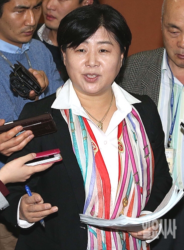 26일 오후, 서울 여의도 국회에서 서영교 새정치연합 원내대변인이 현안 브리핑 직후 취재진의 질문에 답하고 있다.