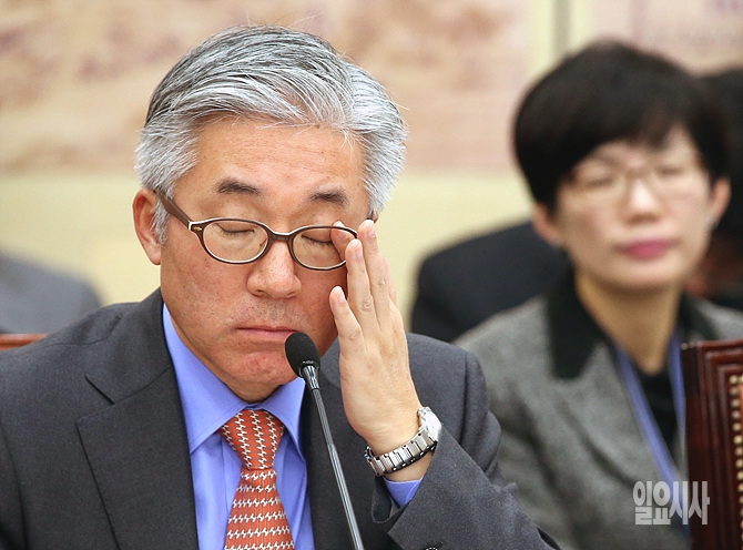 3일, 서울 여의도 국회 교육문화체육관광위원회 회의실에서 열린 전체회의 도중 김종덕 문체부장관이 의원들의 질의에 곤란한 표정을 하고 있다.