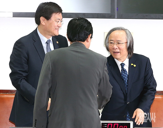 9일, 서울 여의도 국회에서 열린 국민안전특별혁신위원회 전체회의 직전, 새정치민주연합 전병헌 의원과 이주영 해양수산부장관이 악수를 나누고 있다.