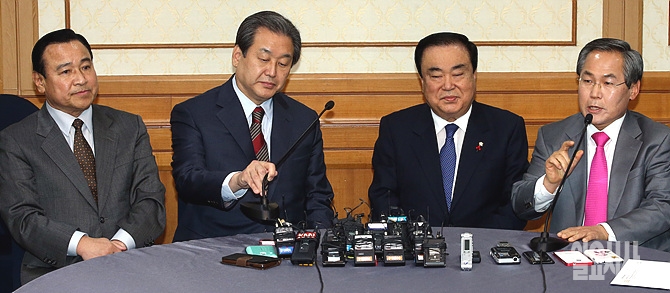 10일, 서울 여의도 국회 귀빈식당에서 새누리당 김무성 대표(사진 왼쪽서 두 번째)·새정치민주연합 문희상 비상대책위원장(사진 오른쪽서 두 번째), 이완구(사진 왼쪽)·우윤근 원내대표 등 지도부가 '여야 2+2회동'을 갖고 있는 가운데, 우 원내대표가 발언하고 있다.
