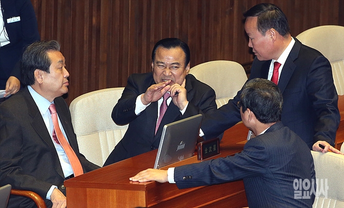 16일, 서울 여의도 국회 본회의장에서 열린 긴급현안질의 직전, 새누리당 김무성 대표, 이완구 원내대표, 김재원 원내수석부대표, 김학용 대표비서실장 등 지도부가 잠시 이야기를 나누고 있다.