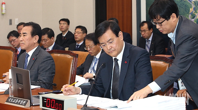 22일, 서울 여의도 국회에서 국토교통위원회 전체회의가 열린 가운데, 서승환 국토교통부장관이 관계자로부터 보고받고 있다.