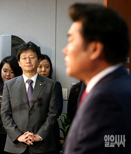 28일, 서울 여의도 국회 정론관에서 원유철 새누리당 정책위의장 후보가 '원내대표 경선 출마 기자회견'을 갖고 있는 가운데, 원내대표 경선에 출사표를 던진 유승민 후보가 자신의 차례를 기다리며 원 후보를 지켜보고 있다.