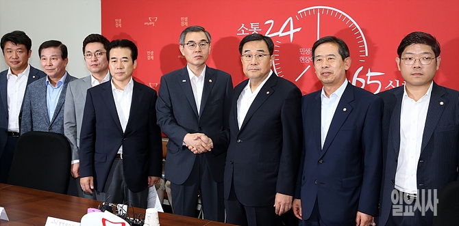 김정훈 새누리당 정책위의장과 정재찬 공정거래위원장이 6일, 서울 여의도 국회서 열린 롯데 등 대기업소유구조 관련 당정협의에 앞서 악수를 나누고 있다.