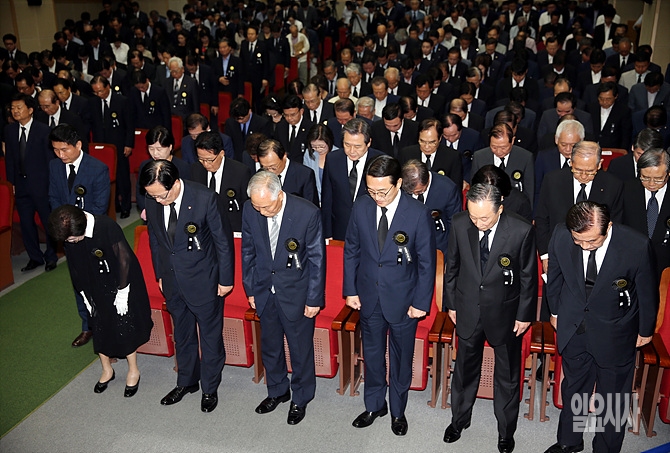 18일, 서울 동작구 국립현충원 '김대중 대통령 서거 6주년 추도식' 참석자들이 잠시 묵념을 하고 있다.