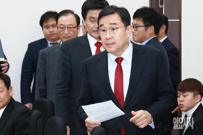 김정훈 새누리당 정책위의장이 8일 오전 서울 여의도 국회에서 열린 북핵 관련 전문가 긴급 간담회에 입장하고 있다.