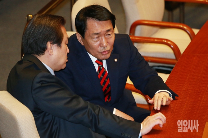 새누리당 김무성 대표와 안상수 의원이 8일 오후 서울 여의도 국회에서 열린 본회의에서 대화를 나누고 있다.
