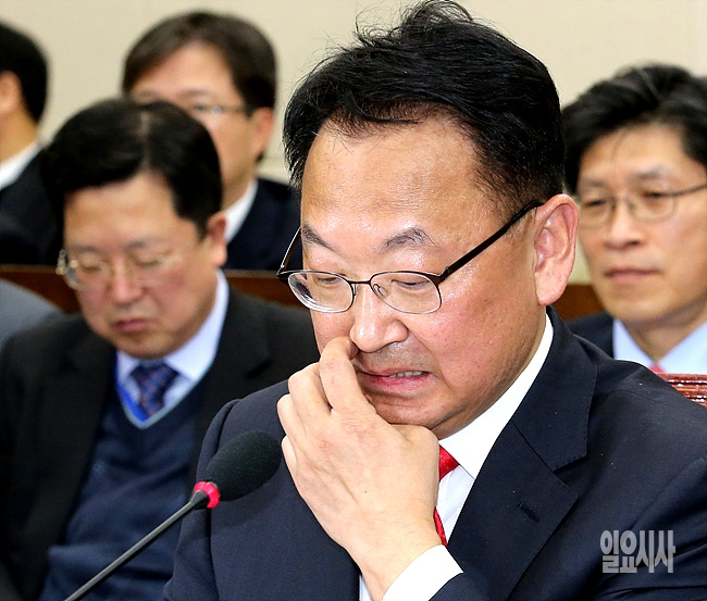 11일, 서울 여의도 국회서 열린 유일호 경제부총리 겸 기획재정부장관 후보자가 인사청문회 도중 잠시 곤란한 표정을 짓고 있다.