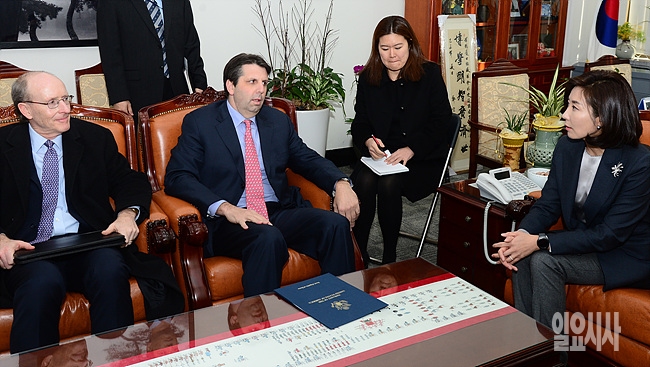 11일, 서울 여의도 국회 외교통상통일위원회 위원장실에서 나경원 외통위원장(사진 오른쪽)과 마크 리퍼트 주한미국대사가 간담회 전 회동을 갖고 있다.