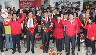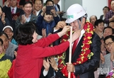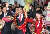[포토] 꽃목걸이 목에 거는 오신환