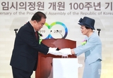 [포토] 홍창휴 여사로부터 임시의정원 관인 전달받는 문희상 의장