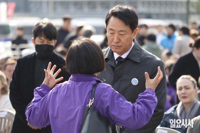 [포토] 이태원 참사 유족에 항의받는 오세훈 서울시장