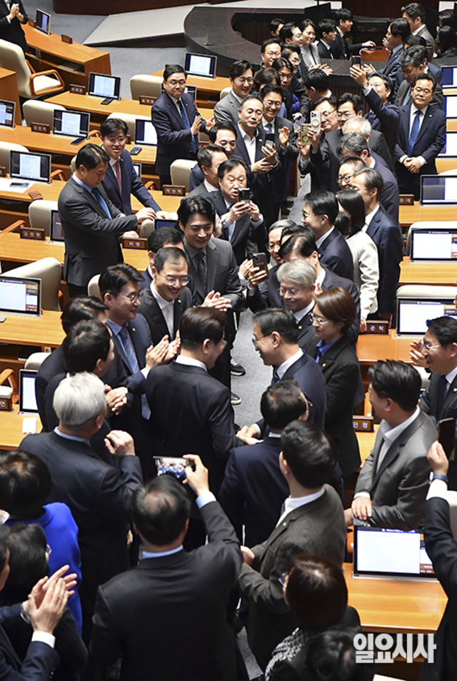 [포토] 여당 의원들과 악수하며 본회의장 들어서는 이재명 대통령