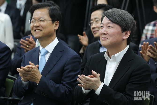 15일 오전 서울 마포구 국민의당 당사에서 열린 당선자 대회 및 선대위 해단식에서 국민의당 안철수, 천정배 공동대표가 박수를 치고 있다.