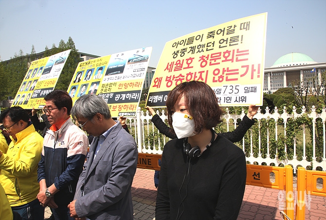 25일, 4·16 세월호 참사 진상규명 및 안전사회 건설을 위한 피해자 가족협의회 회원들이 서울 여의도 국회 앞에서 세월호 진상규명을 요구하는 특별법 개정 및 특검실시 촉구를 요구하는 기자회견을 갖고 있는 가운데, 한 회원이 '아이들이 죽어갈 때 생중계했던 언론! 세월호 청문회는 왜 방송하지 않는가!'라는 플래카드를 들고 있다.