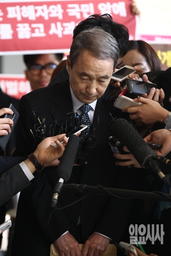 신현우 옥시 전 대표이사가 26일 오전 서울 서초구 서울중앙지검에서 피의자 신분으로 소환조사를 받기 전 고개를 숙이고 취재진의 질문을 듣고 있다.