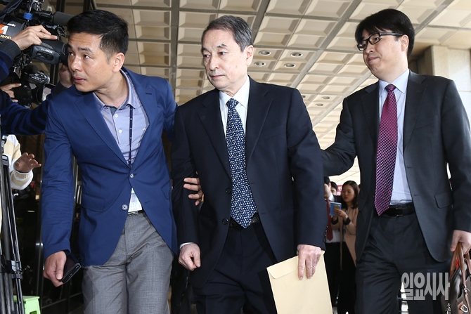신현우 옥시 전 대표이사가 26일 오전 서울 서초구 서울중앙지검에서 피의자 신분으로 소환조사를 받기위해 검찰 청사로 들어가고 있다.