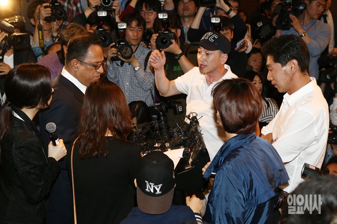 2일 오전 서울 영등포구 콘래드호텔에서 열린 가습기 살균제 관련 입장발표 기자회견 중 가습기 살균제 피해자 가족들이 아타울라시드 사프달 옥시레킷벤키저(현 RB코리아) 대표에게 항의를 하고 있다.