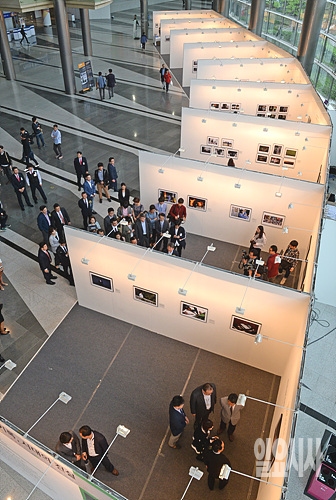 3일, 서울 강남구 코엑스에서 '제52회 한국보도사진전'이 열린 가운데, 새누리당 원유철 원내대표, 김종인 더불어민주당 대표, 국민의당 안철수 공동대표, 정의당 심상정 대표 등이 전시된 사진들을 감상하고 있다. (사진=사진공동취재단)