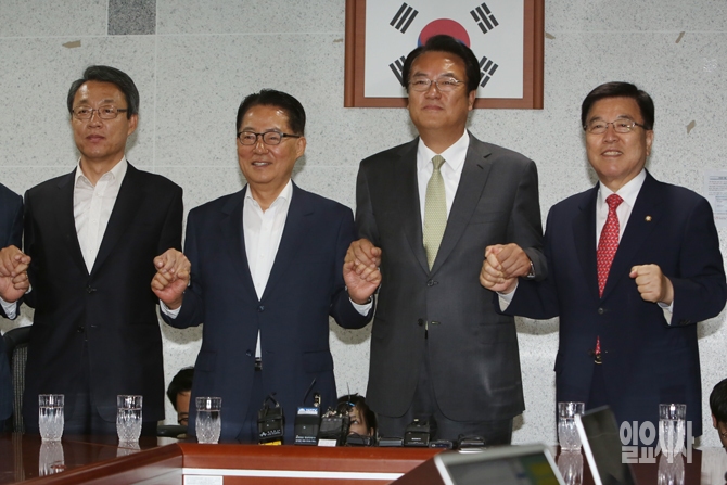 4일 오전 서울 여의도 국회에서 국민의당 박지원 원내대표를 예방한 새누리당 정진석 원내대표와 김광림 정책위의장이 포토타임을 갖고 있다.