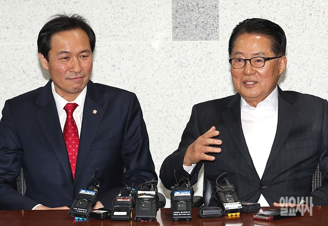 9일, 서울 여의도 국회서 우상호 더불어민주당 신임 원내대표(사진 왼쪽)가 국민의당 박지원 원내대표를 예방한 자리에서 박 원내대표가 발언하고 있다.