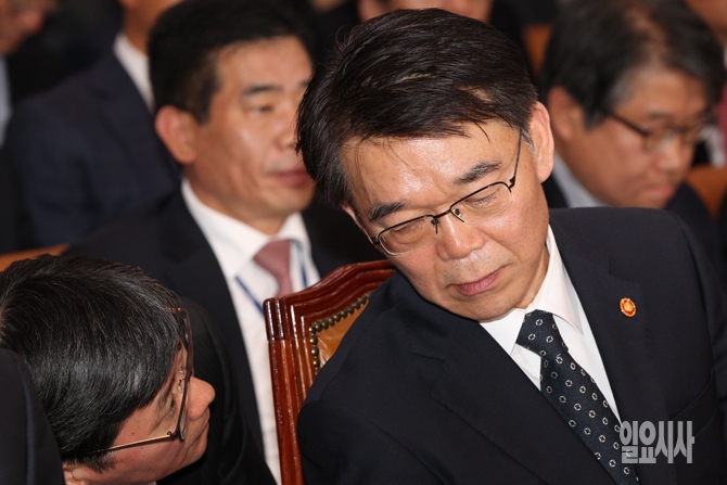 12일 오전 서울 여의도 국회에서 열린 국회 국토교통위원회 전체회의에서 강호인 국토교통부 장관이 관계자에게 질의 관련 사항을 보고 받고 있다.
