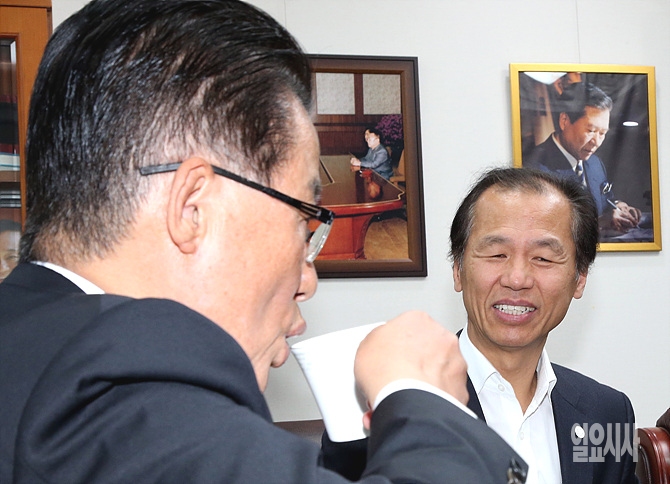 16일, 최문순 강원도지사(사진 오른쪽)가 서울 여의도 국회 국민의당 박지원 원내대표를 예방해 환담을 나누고 있는 가운데, 박 원내대표가 뜨거운 차를 마시고 있다.