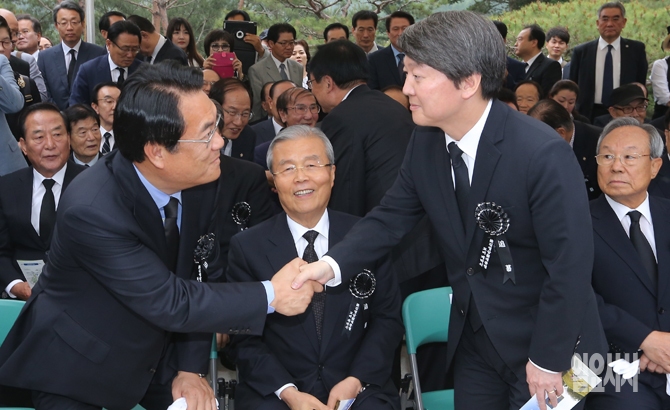 26일 오후 동작동 국립현충원에서 열린 고 김영삼 전 대통령 묘비 제막식에서 정진석 새누리당 원내대표와 안철수 국민의당 대표가 인사를 나누고 있다.