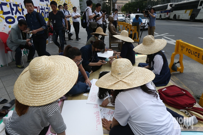 한 30대 여성의 망치 테러에 의해 일본대사관 앞 위안부 소녀상이 훼손된 가운데 3일 오후 서울 종로구 일본대사관 앞 일본군 위안부 평화의 소녀상을 지키는 대학생들이 소녀상 망치테러를 규탄하는 피켓을 만들고 있다.