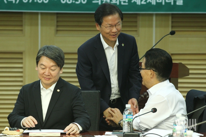 9일 오전 서울 여의도 국회의원회관에서 열린 국민의당 제13차 정책역량강화 워크숍에서 국민의당 천정배 공동대표가 박지원 원내대표와 인사를 하고 있다.