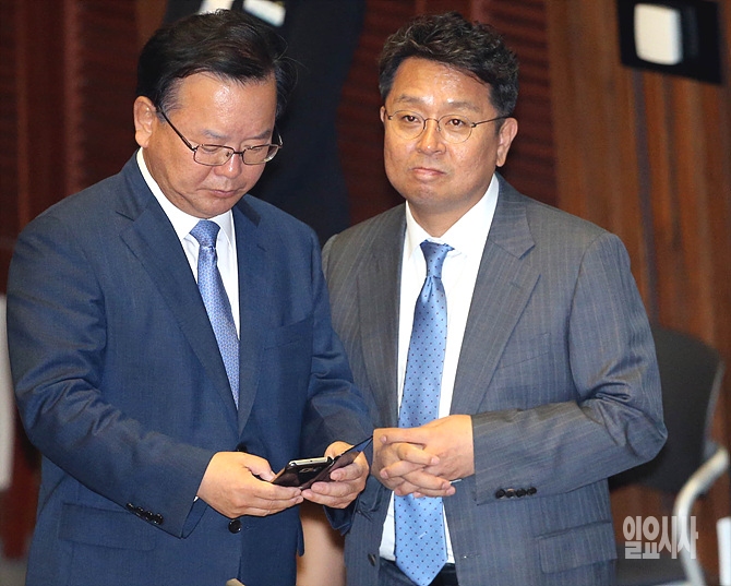 22일, 서울 여의도 국회 본회의장서 본회의에 참석한 더불어민주당 김부겸(사진 왼쪽)·이철희 의원이 잠시 다른 생각을 하고 있다.