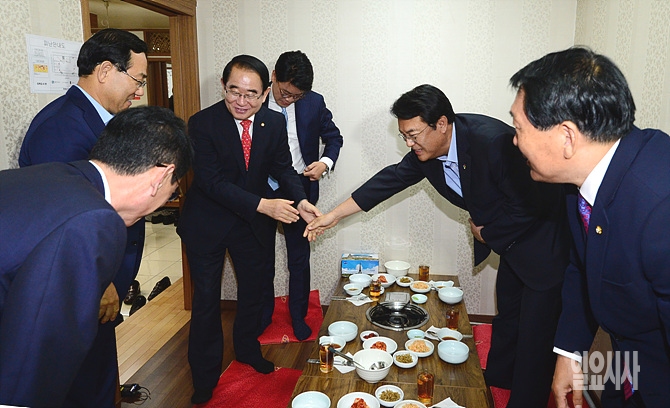 29일, 서울 여의도 모처 식당에서 정진석 새누리당 원내대표(사진 오른쪽)가 복당파 의원들과 오찬 회동을 가진 가운데, 정 원내대표가 박명재 사무총장과 악수를 나누고 있다.