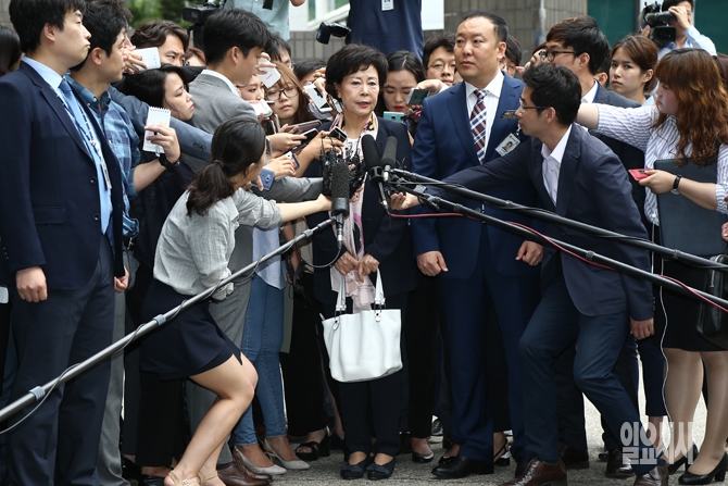 롯데그룹에 대한 검찰의 수사가 전방위 수사가 계속되고 있는 가운데 1일 오전 서울 서초구 서울중앙지방검찰청에서 롯데그룹 총수일가 중 처음으로 신격호 롯데그룹 총괄회장의 장녀인 신영자 롯데장학재단 이사장이 네이처리퍼블릭의 롯데면세점 입점 로비 의혹과 관련해 피의자신분으로 검찰의 소환조사에 출석하기 전 취재진의 질문에 답변하고 있다.